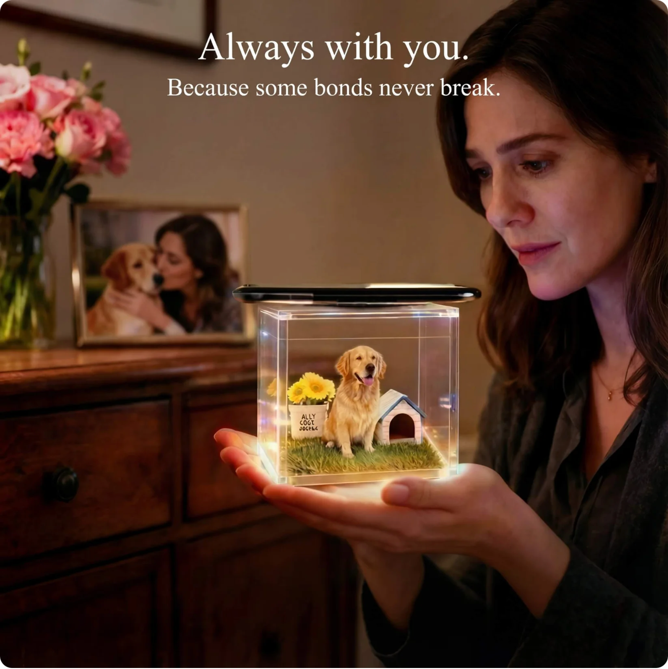 Once ready, place the hologram and enjoy a stunning 3D display that brings your pet’s presence back into your space, anytime you wish.